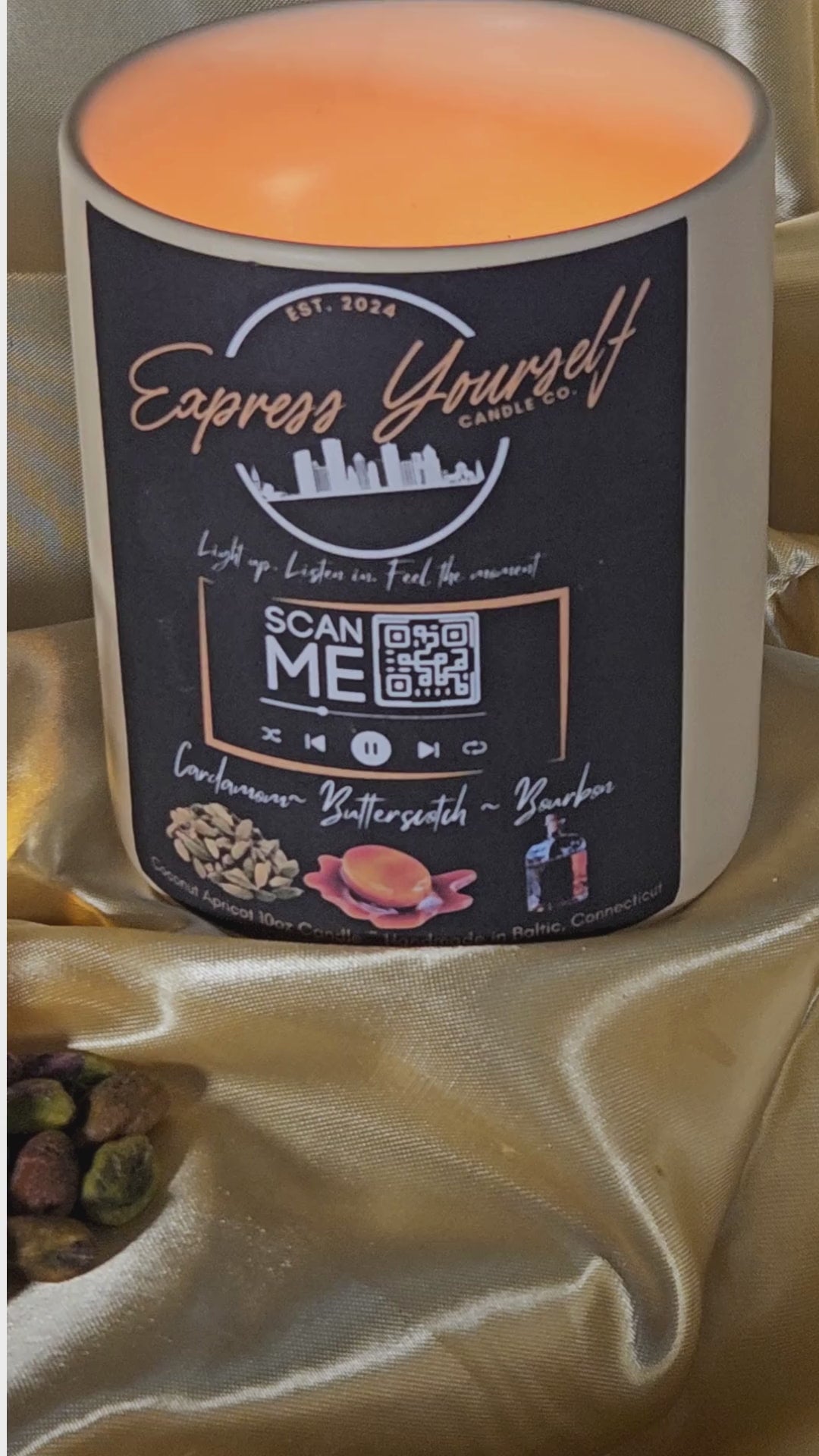 Bourbon scented candle, butterscotch candle, spiced candle, poetry inspired candle, audio candle, storytelling candle, QR code candle, handmade luxury candle, coconut apricot wax candle, clean burning candle, cozy home fragrance, gift for book lovers, Connecticut candle company.